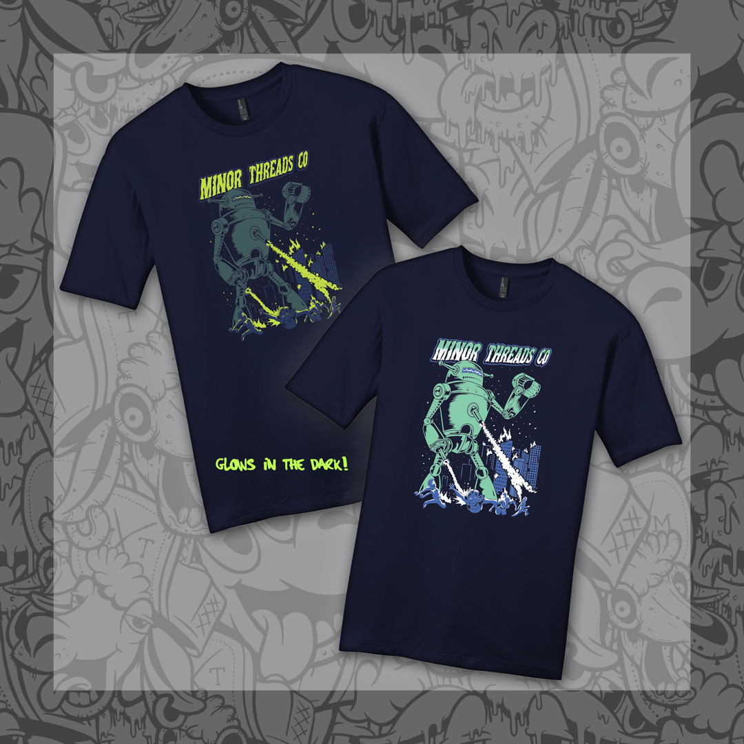 Who pissed off the giant, glow-in-the-dark robot? Mechanical mayhem that lights up at night on a black tee.